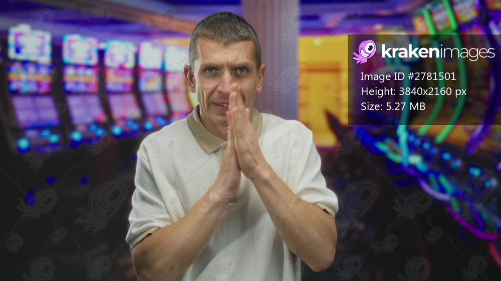 Man looking cold inside a vibrant casino surrounded by glowing slot machines capturing an unusual indoor atmosphere with an expression of discomfort and chilliness. - Kraken Images