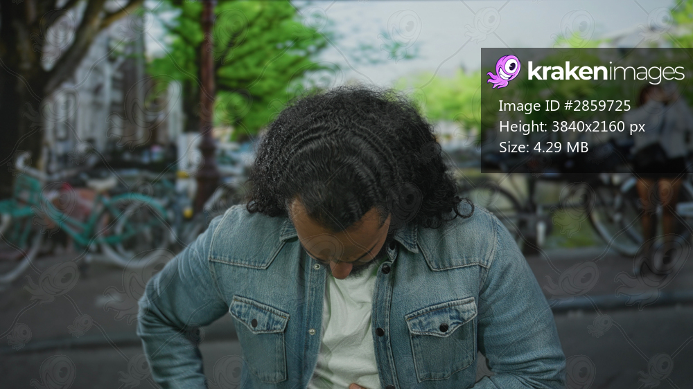 Man looking down with hands on stomach, wearing denim jacket on a canal street in amsterdam; quiet concern.