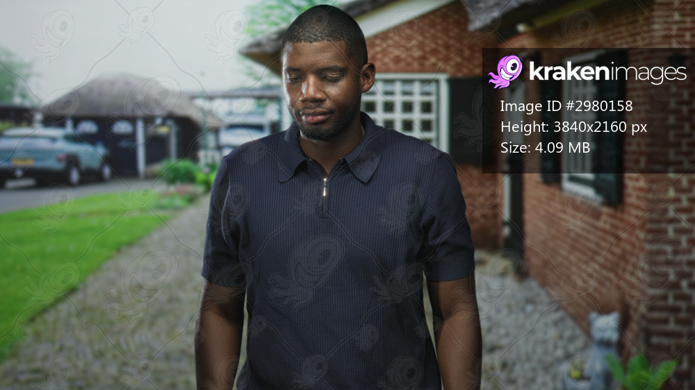 Man looking down in front of a brick house building on a cobblestone driveway, casual polo shirt; quiet contemplation.