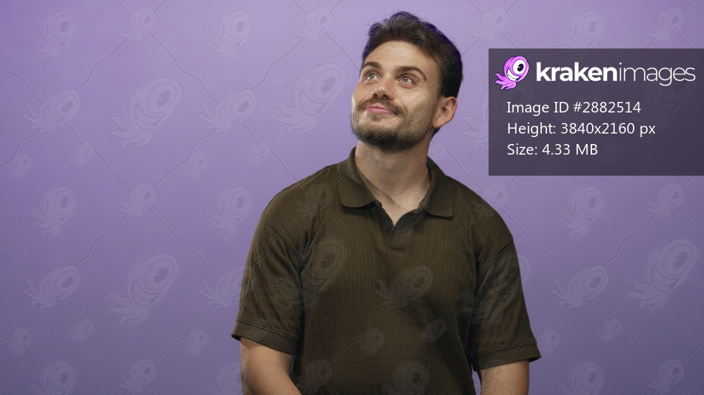 Man looking up with slight smile and short beard, wearing brown polo with visible bare forearms in purple studio; contemplation introspection.