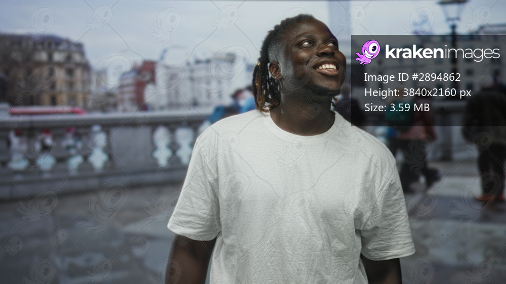 Man looking up and smiling while standing on street near bridge and monument in urban square wearing white t shirt with dreadlocks; joy.
