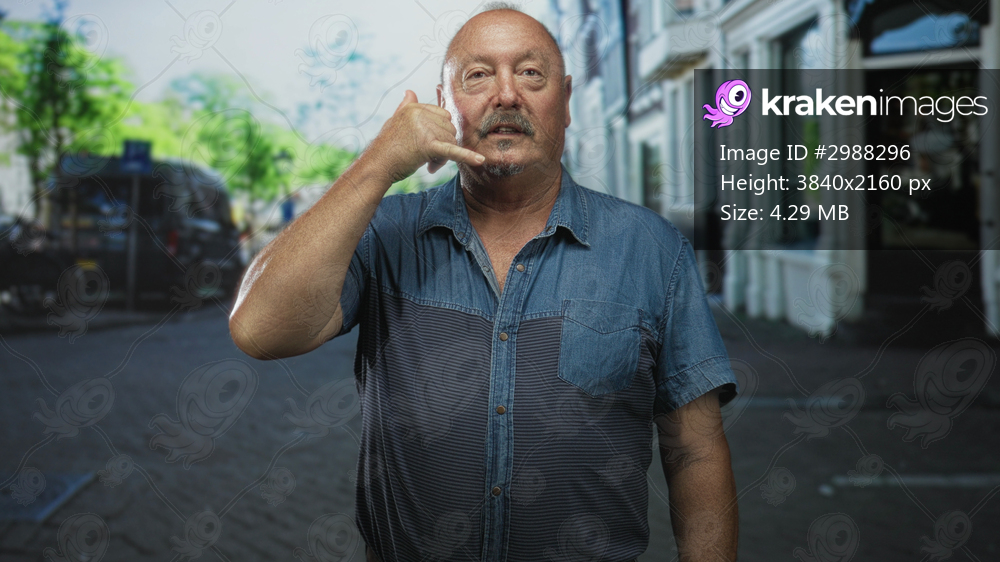 Man makes a call me hand gesture with thumb to ear and little finger to mouth on a city street; friendly invitation.
