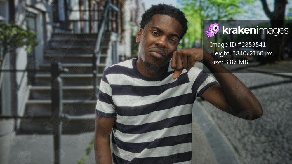 Man makes crying gesture with hand to eye on a quiet residential street wearing a striped shirt; sadness.