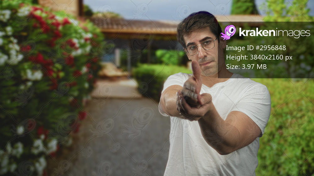 Man makes finger gun gesture with hands and visible forearm pointed toward camera standing on a garden walkway in front of a building; playful confidence. - Kraken Images
