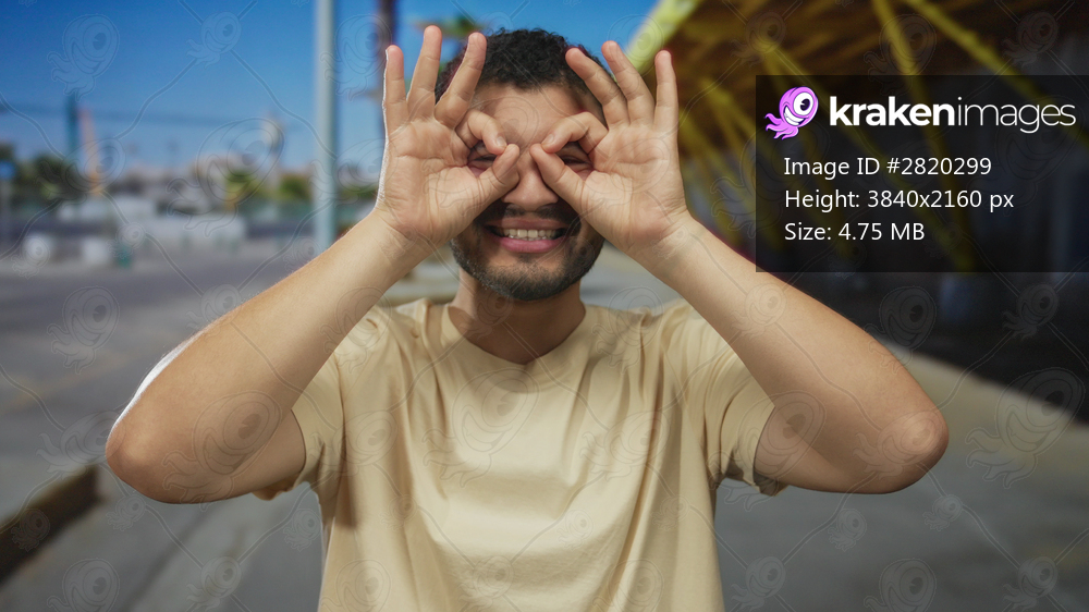 Man makes hand binoculars with fingers framing eyes on street under yellow steel beams; playfulness.