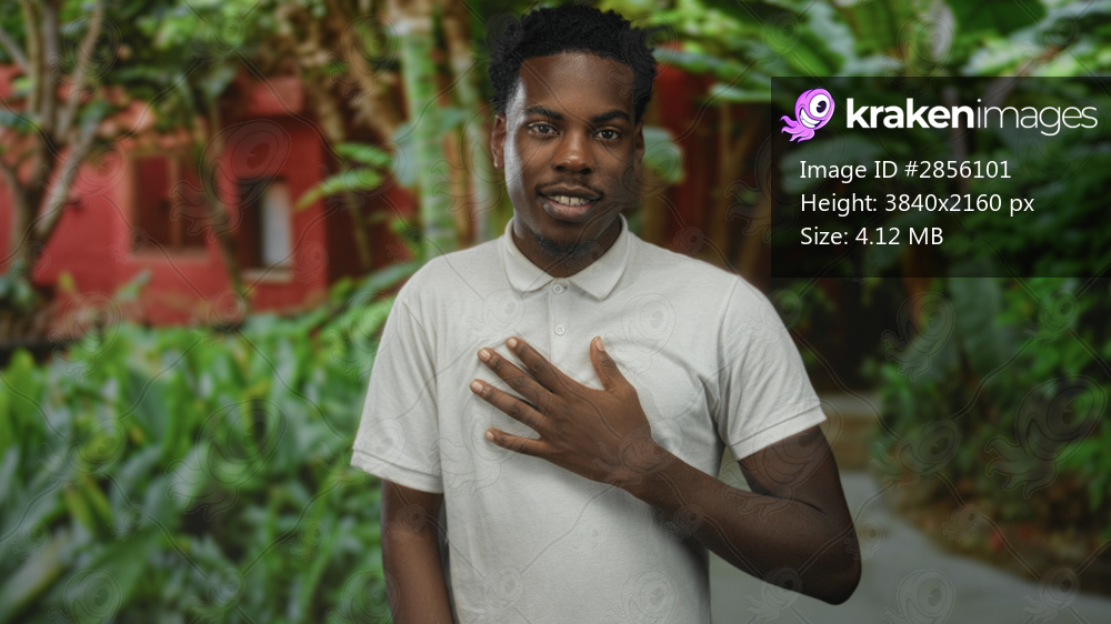 Man makes hand on chest gesture in building corridor framed by green foliage while wearing white tshirt; gratitude.