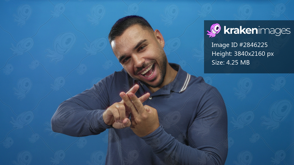 Man makes hashtag gesture with intertwined fingers in blue studio setting, smiling and leaning forward toward camera; joy fun connection communication. - Kraken Images