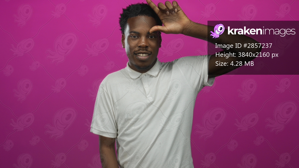 Man makes loser sign with hand on forehead while smiling in a bright pink studio; playful mockery insult.