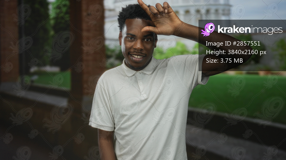 Man makes loser sign with thumb and index finger on forehead at building exterior near pisa tower under daylight; teasing.