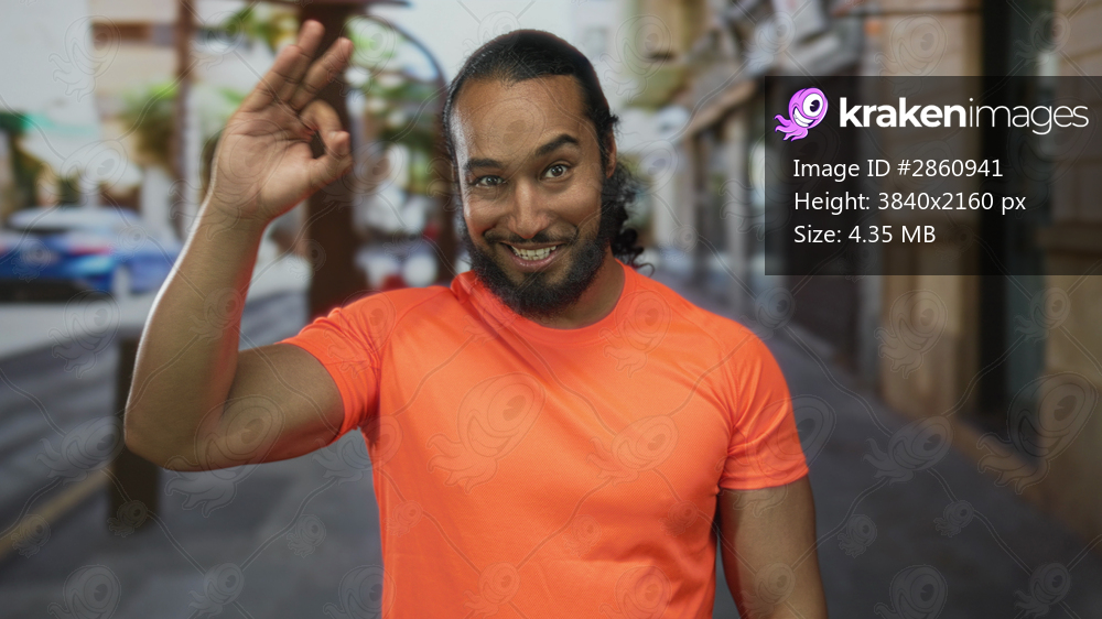 Man makes ok sign with raised hand on urban street wearing bright orange shirt, smiling at camera; friendly optimism.