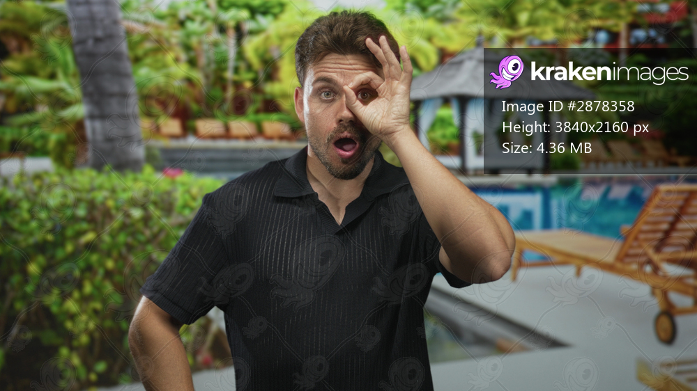 Man makes ok sign to eye at hotel building poolside, mouth open in expressive gesture; playful surprise.
