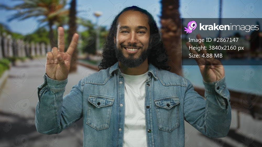 Man makes peace sign with both hands on street promenade by water and palm trees wearing denim jacket and white tshirt; peaceful joy.