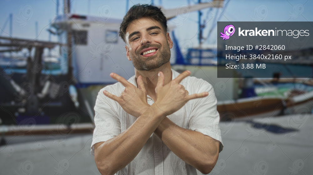 Man makes rock horns gesture with bare hands in front of boat on sunny street by seaside port; playfulness.