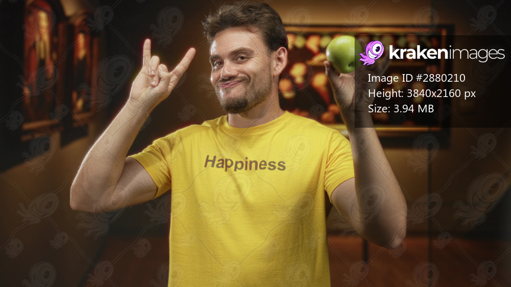 Man makes rock horns with one hand and holds green apple near painting in gallery building; playful mischief.