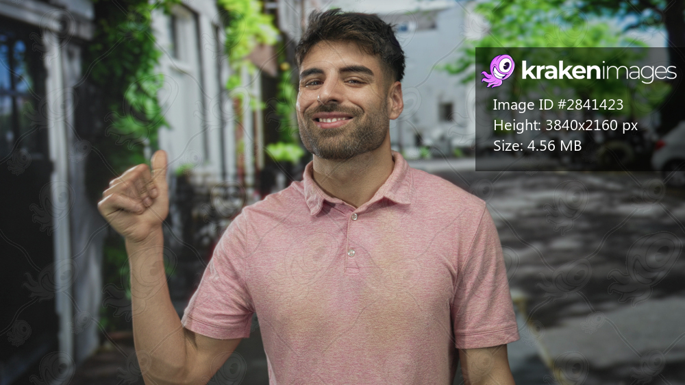 Man makes thumbs up gesture on sunny urban street, wearing pink polo shirt and smiling at camera; approval.