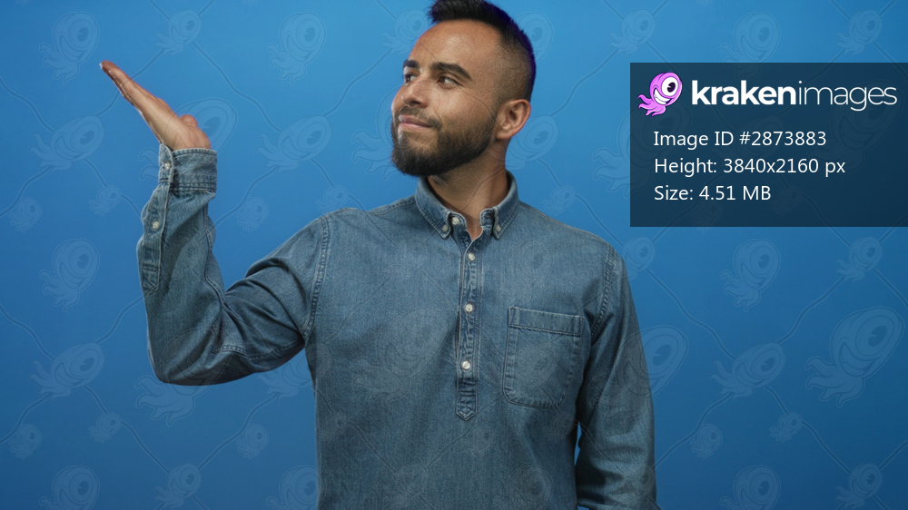 Man making a two finger peace sign with raised hand and visible beard wearing denim shirt in blue studio; confidence.