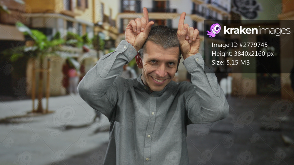 Man making funny gesture with fingers resembling horns on busy urban street.