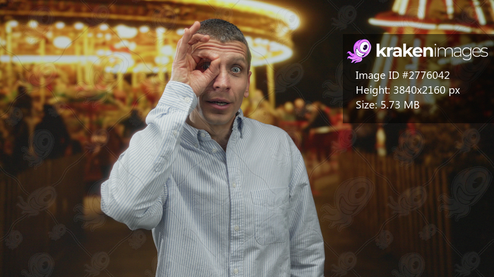 Man making gesture in front of eye at night fair with carousel lights creating vibrant outdoor atmosphere.