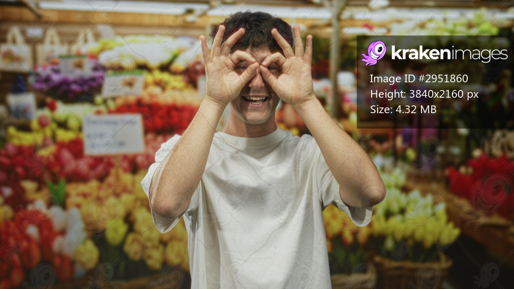 Man making hand binoculars with bare hands over eyes in a flower market building among colorful tulips and bouquets; playful curiosity.