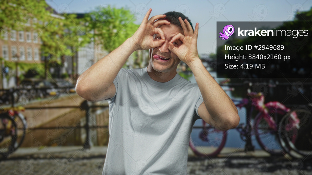 Man making hand binoculars with hands and tongue out, wearing white tshirt near bicycles and canal on street in amsterdam; playful curiosity.