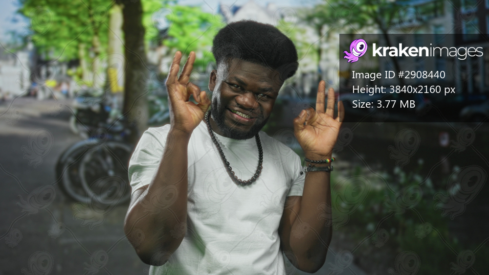Man making hand binoculars and ok sign on a sunny street by a canal with bicycles and parked cars visible; playful curiosity.