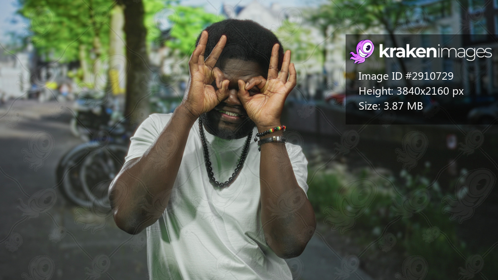 Man making hand binoculars and ok sign on a sunny street by a canal with bicycles and parked cars visible; playful curiosity.
