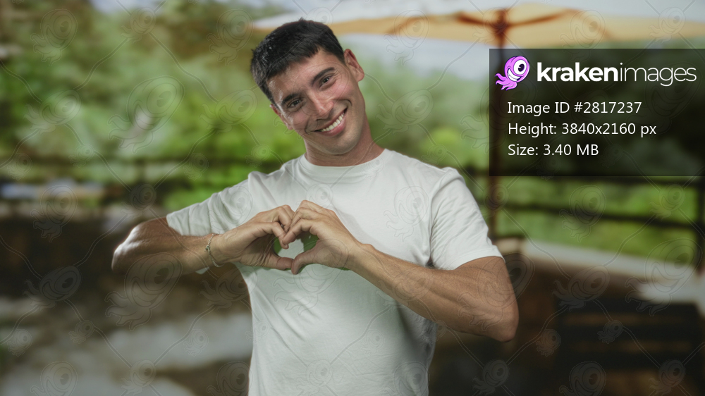 Man making heart shape with hands at a sunny restaurant terrace building overlooking greenery; love.