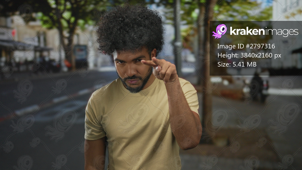 Man making neck-cutting gesture on city street with trees and buildings in the background, conveying an intense emotion.