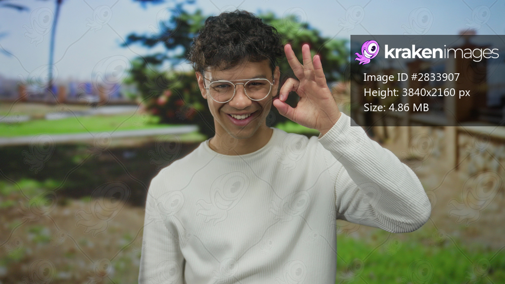 Man making ok gesture with hand against sunlit green park fence outdoors under bright daylight; confidence.