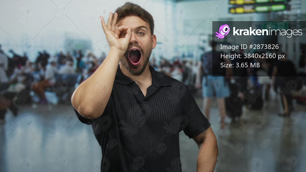 Man making ok sign with hand at busy airport terminal with travelers and gates visible; joyful travel.