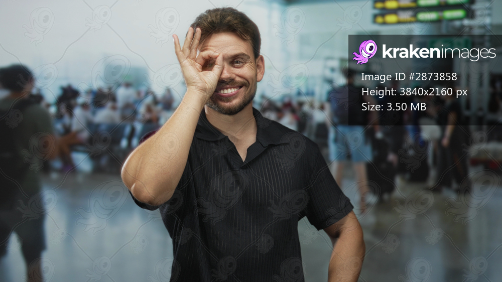 Man making ok sign with hand at busy airport terminal with travelers and gates visible; joyful travel.