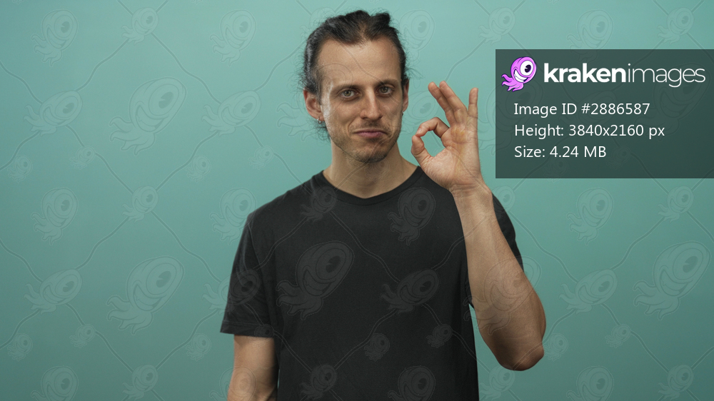 Man making ok sign with hand in teal studio, wearing black t shirt and long hair tied back; approval simplicity.