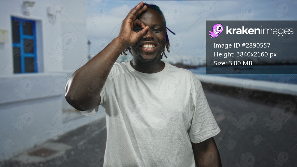 Man making ok sign with his hand at eye level on a seaside street near a white building; joyful play.