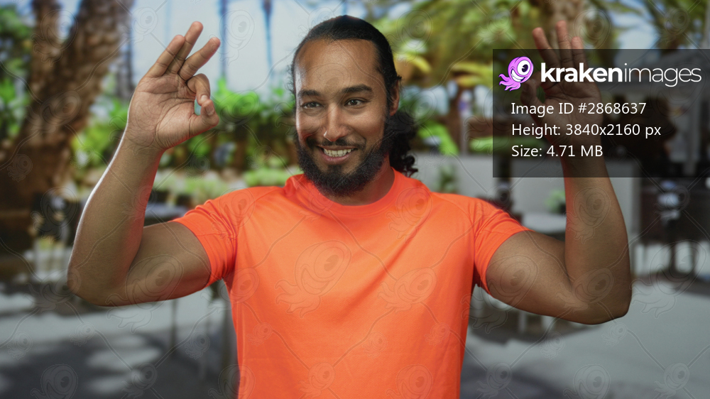 Man making ok sign on outdoor restaurant terrace, smiling in bright orange shirt; approval hospitality.