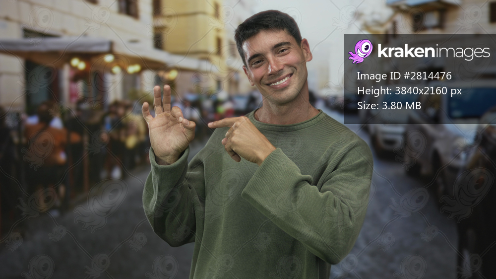 Man making ok sign and pointing finger at hand circle on street terrace outside restaurant; satisfaction.