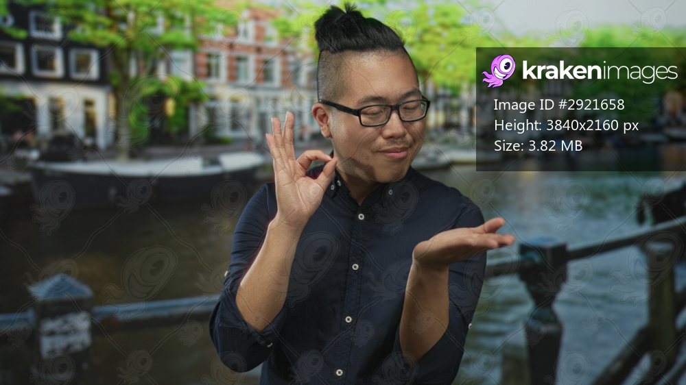 Man making ok sign and presenting open hand on a canal street in amsterdam with boats, railing and buildings visible; approval travel moment.