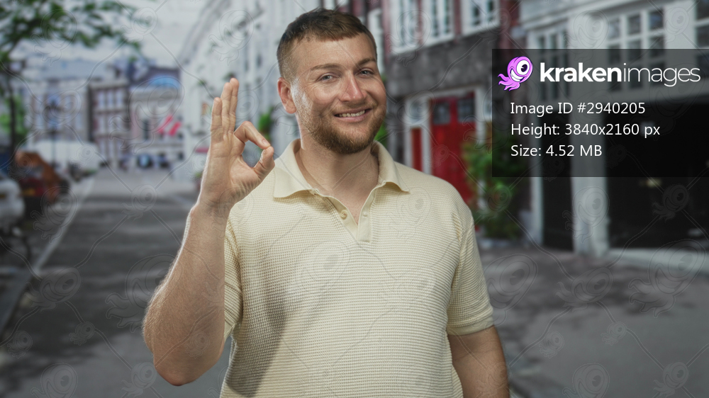 Man making ok sign with right hand on city street, smiling with closed eyes in a cream polo shirt; approval confidence.