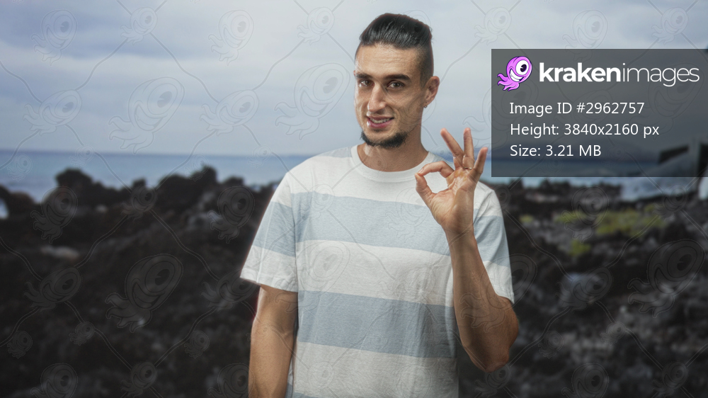 Man making ok sign with right hand, wearing light blue striped shirt and short beard, standing before a rocky shoreline backdrop in studio; calm reflection. - Kraken Images