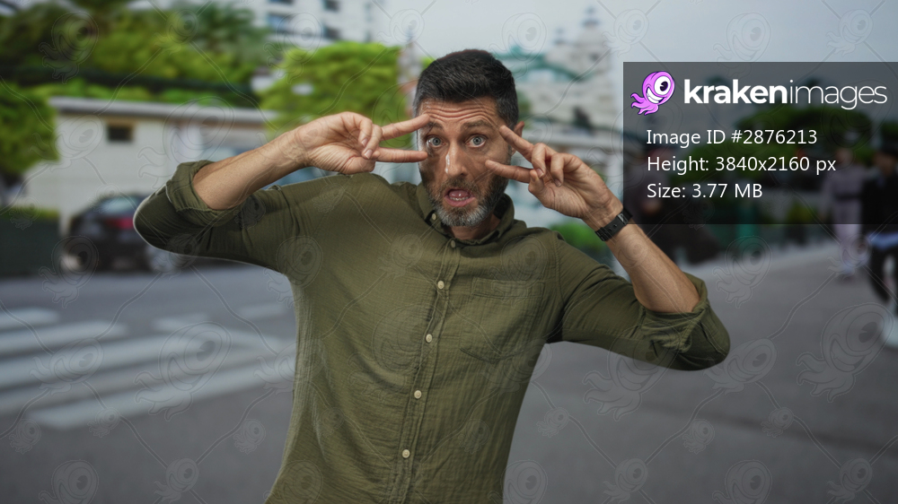Man making peace sign with both hands near eyes on city street crosswalk wearing olive shirt and watch; playful confidence.