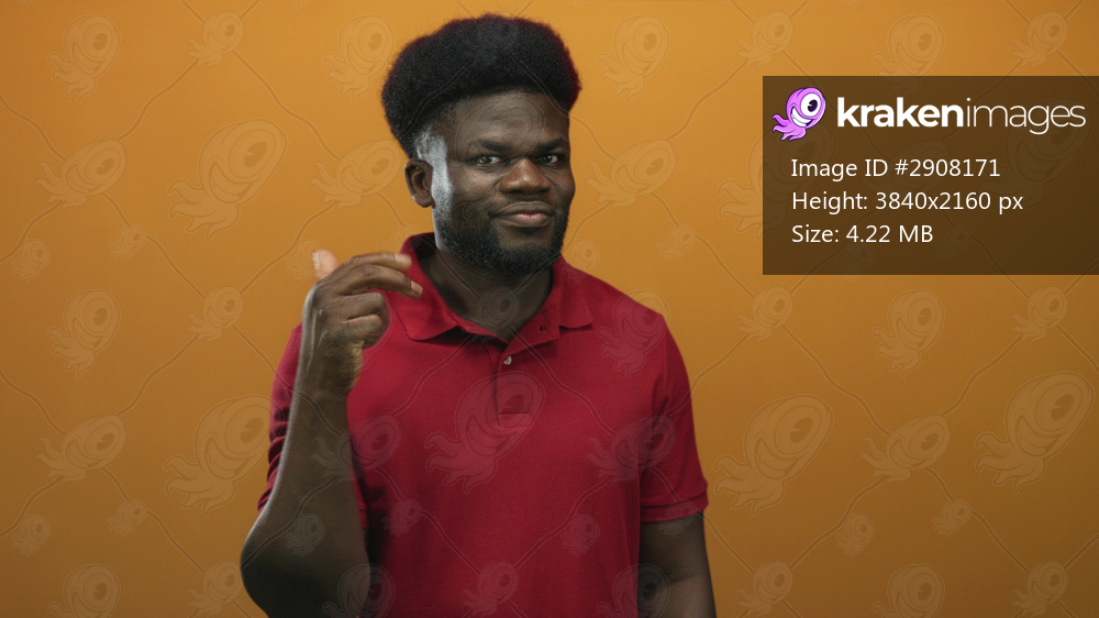 Man making peace sign with fingers wearing red polo against orange wall in studio; confidence victory.