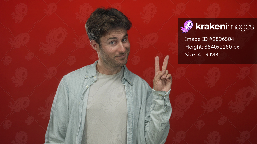 Man making peace sign with right hand in studio red backdrop, wearing denim overshirt and white tee; playful confidence.