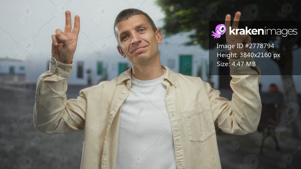 Man making peace signs as he stands on an outdoor street with blurred white buildings and trees, wearing casual shirt and showing positive expression.