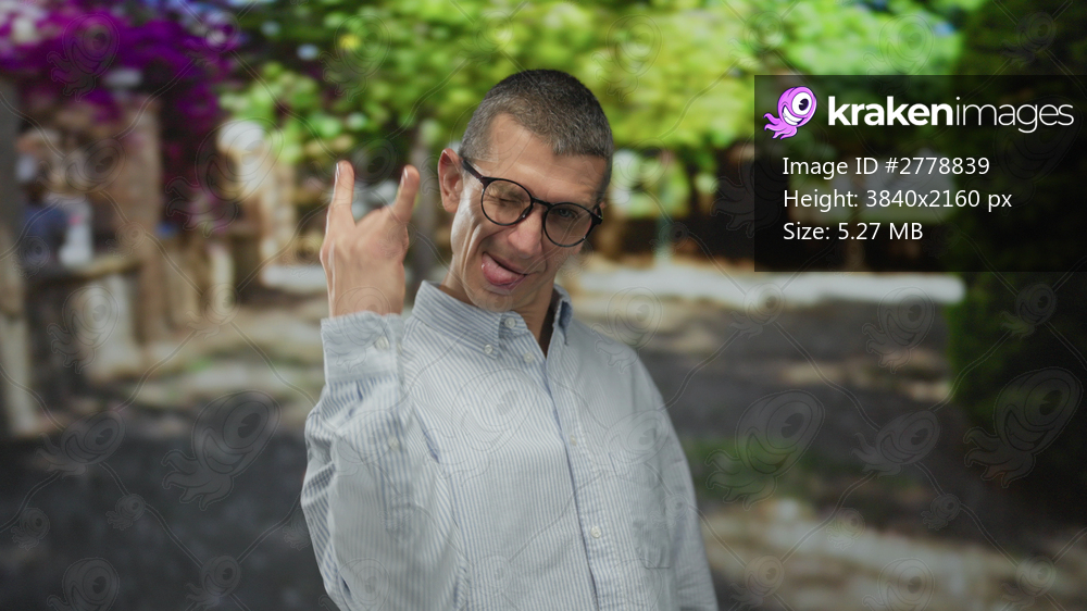 Man making rock gesture and sticking out tongue on a sunny street, wearing glasses and striped shirt with trees in the background, capturing a fun, quirky outdoor moment. - Kraken Images