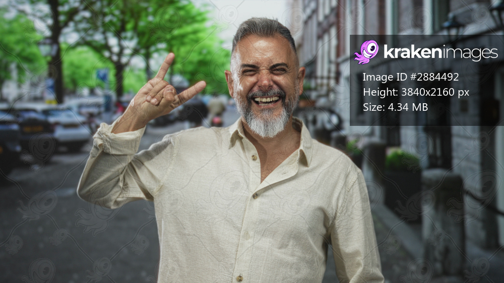 Man making rock horns with hand on a city street, beard visible, squinting grin and beige linen shirt; playful carefree fun.