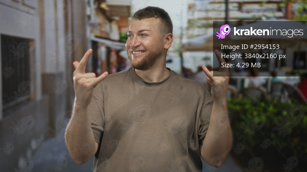 Man making rock horns with hands on a street restaurant terrace, smiling broadly; urban joy celebration.
