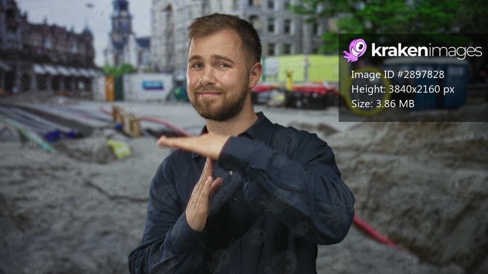 Man making time out gesture with hands at building construction site, wearing navy shirt and slight smile; safety pause caution.