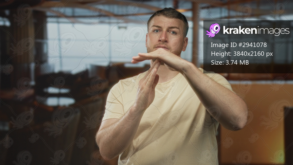 Man making timeout gesture with hands in hotel lounge, wearing beige tshirt and beard, looking serious; boundary warning.