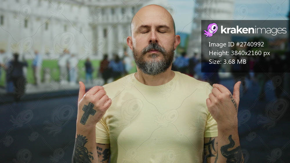 Man meditating calmly with closed eyes in front of the leaning tower of pisa outdoors showcasing tattoos and beard in a serene street setting.