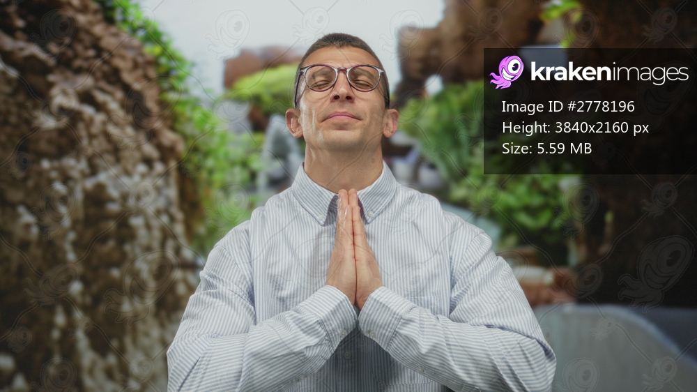 Man meditating outdoors in a lush park environment with hands in prayer position, wearing glasses and a striped shirt, exuding tranquility and mindfulness in nature surroundings. - Kraken Images