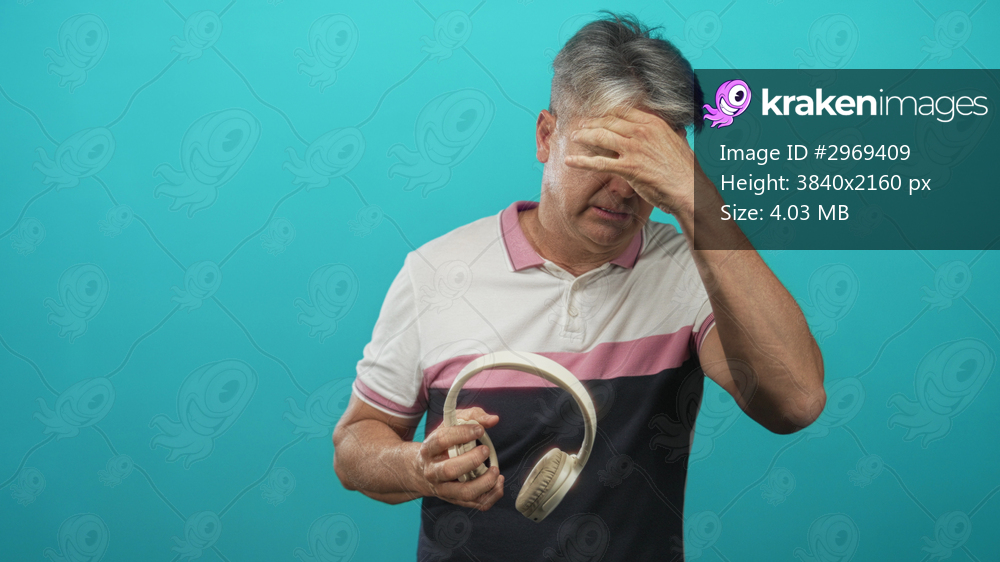 Man middle age grey hair caucasian holding beige headphones, hand to forehead with apparent headache in studio; fatigue.